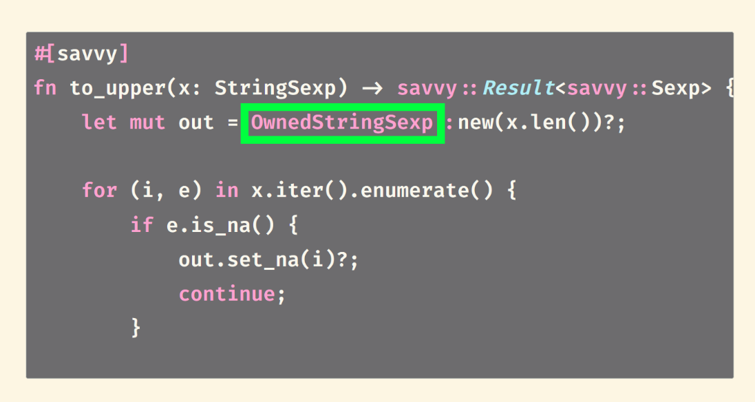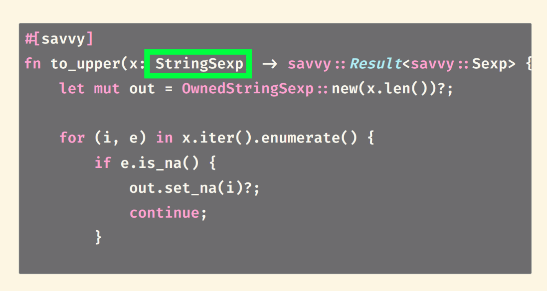 (#[savvy] マクロがどういう Rust コードを生成するかは、ここでは省略。引数の型のチェックとかエラー処理とかです)